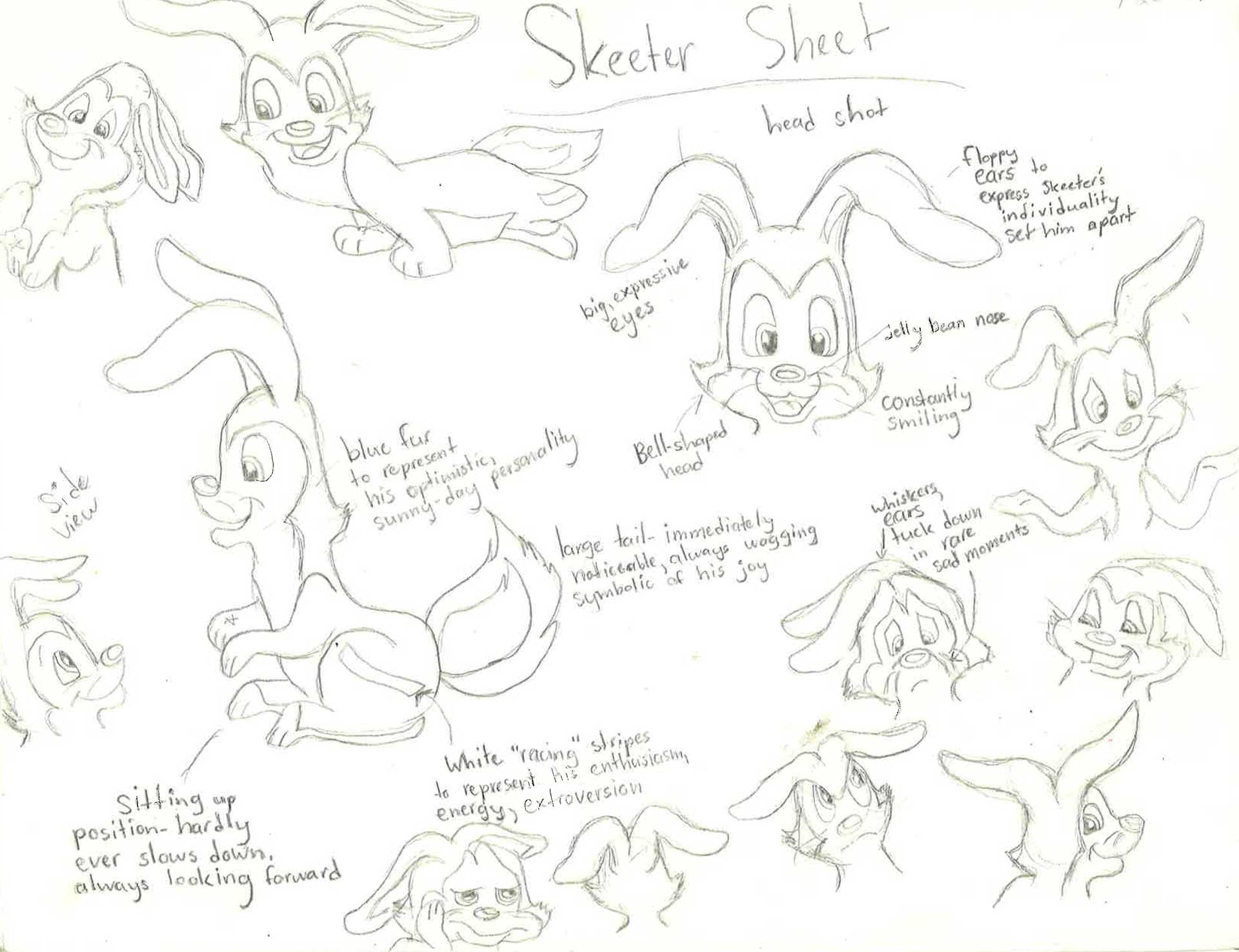 The character sheet for my rabbit character Skeeter highlighting all his unique characteristics ! He is a cheerful blue bunny I created in 9th grade drama class and the main star of my short film A Lesson in Laughter. A rule for him is his ears cannot ever stand straight up, similar to Bugs Bunny or Thumper from Bambi, they are either floppy or bent. That is what visually sets him apart from other animated bunnies. He has sky blue fur because blue is my favorite color and he is the ultimate optimist, like the hope a clear blue sky inspires in me.